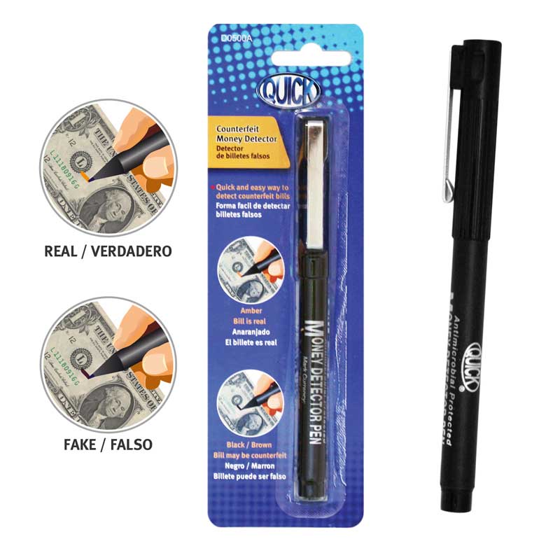 Counterfeit Money Detector Pen is ideal for use in busy retail environments. This quick, inexpensive currency-screening device can be used in conjunction with other counterfeit detection methods. Mark a small line on U.S. currency. When mark is amber, the bill is genuine. If mark is black or dark brown, the bill is suspect.